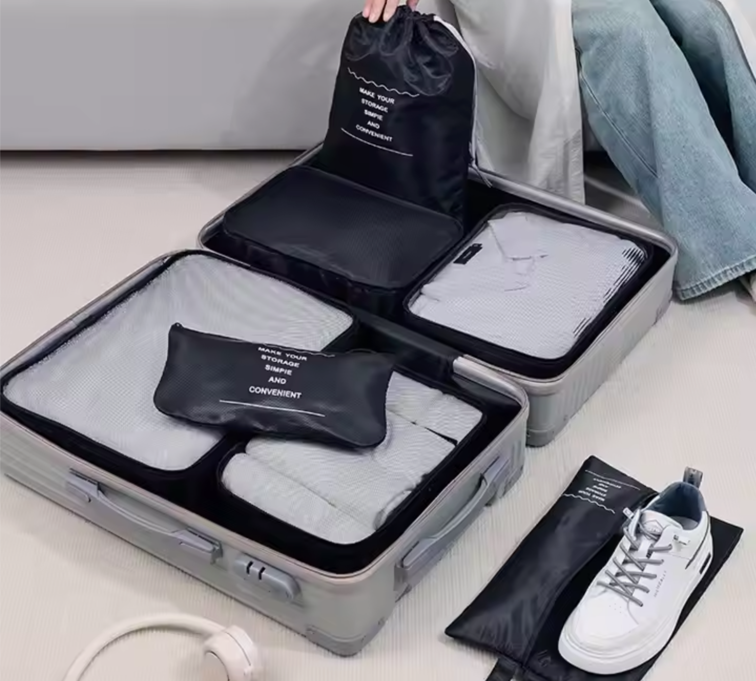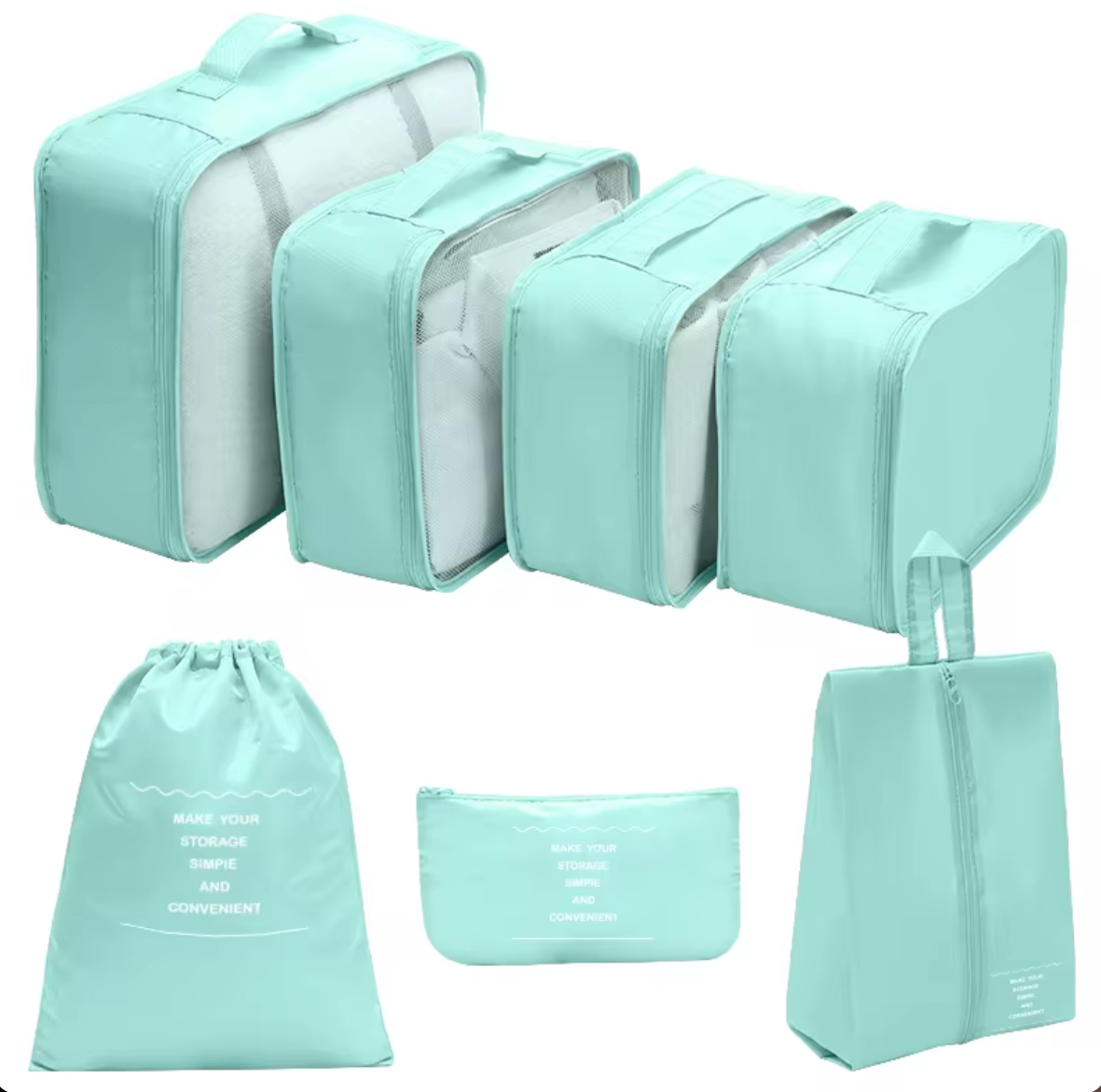 - Juego de 7 piezas de bolsas de viaje, organizador de ropa y kit de maleta para mejor almacenamiento.