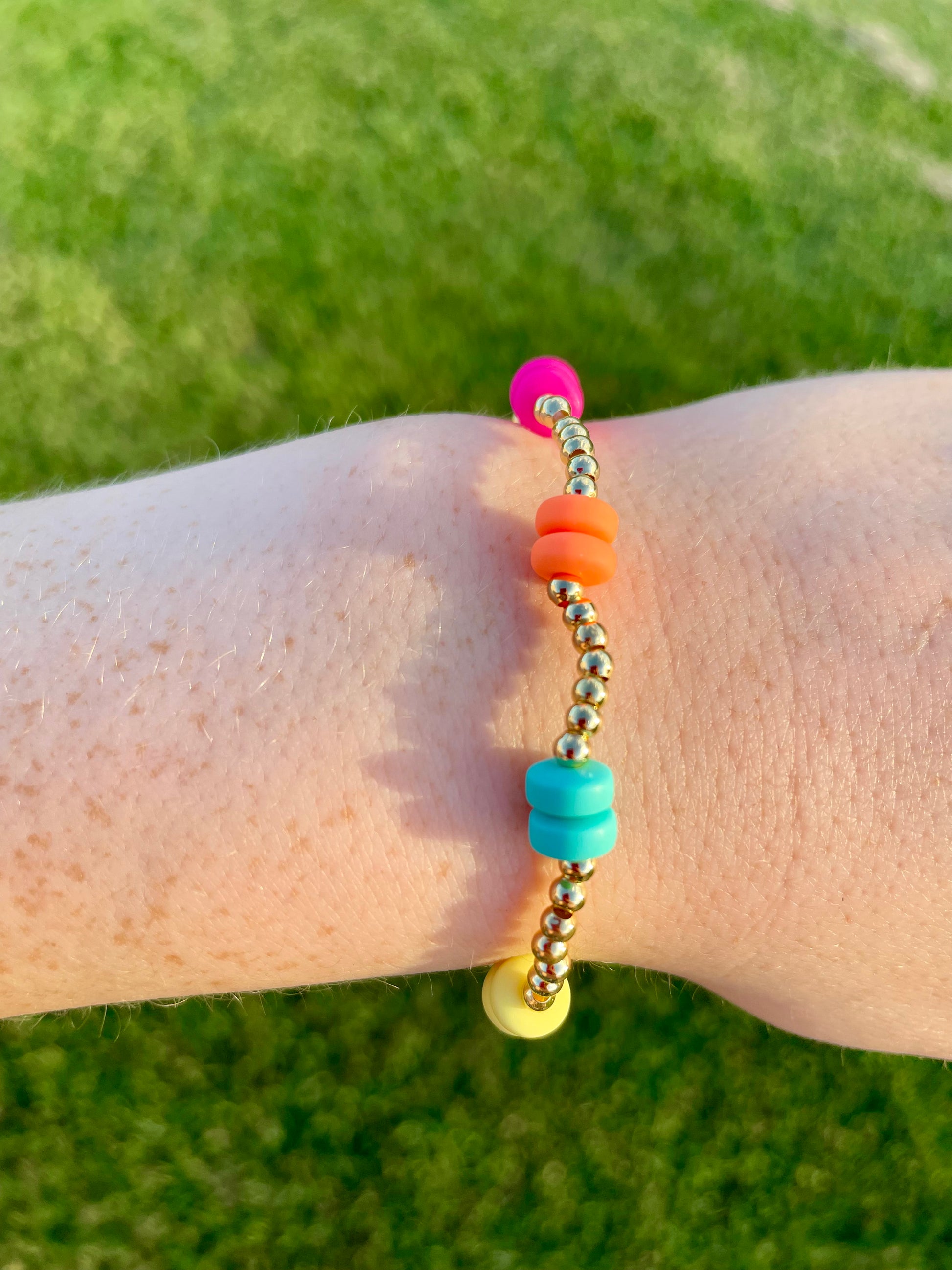 Liviana pulsera vibrante con cuentas doradas brillantes, intercaladas con coloridas cuentas en tonos rosa, naranja, azul, amarillo y perlas.